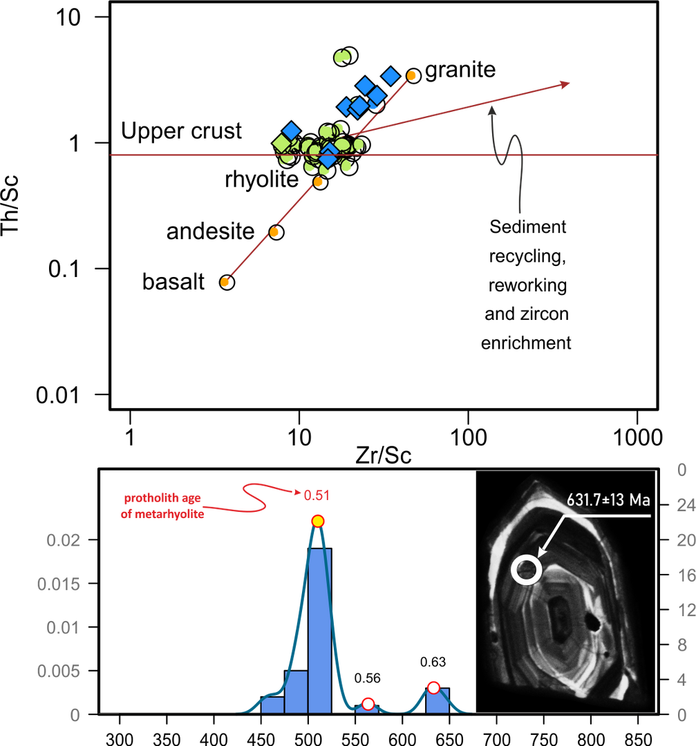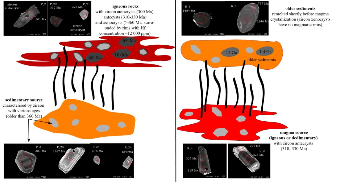 Analysis of provenance of detrital material on the basis of the chemical composition of rocks and dating of detrital zircons.